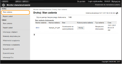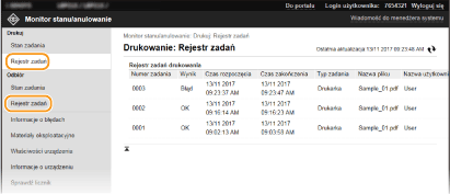 Kliknij opcję [Numer zadania] na dokumentach o wstrzymanym statusie drukowania oraz dokumentach chronionych w celu uzyskania szczegółowych informacji. Można sprawdzić nazwę użytkownika i liczbę stron drukowanego dokumentu.
