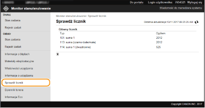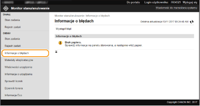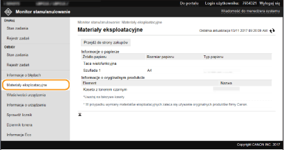 Zostanie wyświetlona informacja o rozmiarze i typie papieru dla źródła papieru, numerze modelu kasety z tonerem itp. Możesz także kliknąć przycisk [Sprawdź szczegółowe informacje o materiałach eksploatacyjnych] na stronie portalu (stronie głównej), aby wyświetlić ekran sprawdzania stanu materiałów eksploatacyjnych (