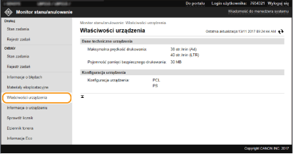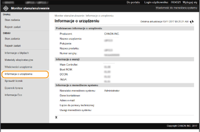 Wyświetlane są informacje o urządzeniu oraz menedżerze systemu. Tutaj wyświetlane są nazwa urządzenia i inne informacje na temat menedżera systemu odpowiadające ustawieniom skonfigurowanym w obszarze [Informacje o menedżerze systemu] na stronie [Zarządzanie użytkownikami] albo w obszarze [Ustawienia informacji o urządzeniu] na stronie [Zarządzanie urządzeniem].