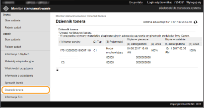 Istnieje możliwość sprawdzenia dzienników użycia zasobników z tonerem oraz innych dzienników.