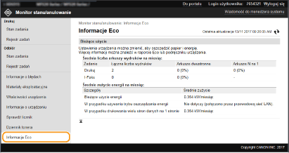 Wyświetlane są całkowita miesięczna liczba wydrukowanych stron i zużytej energii. Można wyświetlić ekran informacji dotyczących ekologii (Eco Information) i zmienić ustawienia, aby zaoszczędzić papier i zużycie energii.