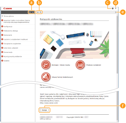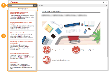 Kliknięcie tego elementu powoduje wyświetlenie instrukcji dotyczących otwierania programu Podręcznik użytkownika, wykonywania wyszukiwania oraz innych informacji.