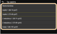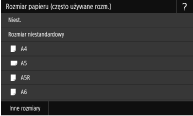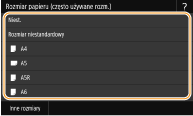 Jeśli pokazany powyżej ekran nie jest wyświetlany podczas ładowania papieruJeśli do tacy wielofunkcyjnej ładowany jest zawsze ten sam format i rodzaj papieru, można pominąć konfigurację ustawień, rejestrując go jako ustawienie domyślne. Jednak po zarejestrowaniu ustawienia domyślnego ekran pokazany powyżej nie jest wyświetlany. Aby wyświetlić ekran, należy wybrać opcję <Określ podczas ładowania papieru> (Zapisywanie ustawień domyślnych papieru dla tacy wielofunkcyjnej).
