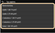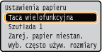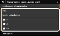 Po zarejestrowaniu ustawienia domyślnego ekran ustawień papieru nie jest wyświetlany przy jego ładowaniu i używana jest zawsze ta sama konfiguracja. Jeśli załadowany zostanie inny format lub typ papieru bez zmiany ustawień, urządzenie może nie drukować poprawnie. Aby uniknąć tego problemu, należy wybrać opcję <Określ podczas ładowania papieru> w kroku 3, a następnie załadować papier.