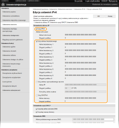 Adresy IPv6 urządzenia można skonfigurować za pomocą Zdalnego interfejsu użytkownika. Przed rozpoczęciem konfiguracji adresów IPv6 należy sprawdzić ustawienia adresu IPv4 (Wyświetlanie ustawień IPv4). Aby korzystać z adresów IPv6, należy poprawnie skonfigurować ustawienia adresu IPv4. Urządzenie może korzystać z następujących wielu adresów IPv6: