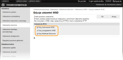 Zaznaczenie tego pola wyboru umożliwia uzyskanie informacji o urządzeniu przez komputer za pomocą interfejsu WSD. To pole wyboru jest zaznaczane automatycznie po zaznaczeniu pola wyboru [Użyj drukowania WSD]. [Użyj Multicast Discovery]