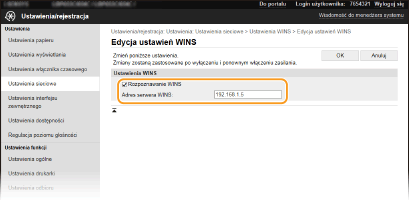 Zaznacz pole wyboru [Rozpoznawanie WINS] i podaj wymagane ustawienia.