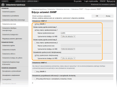 Jeśli włączone są obie wersje protokołu SNMP, zalecane jest wybranie w ustawieniach uprawnień dostępu do obiektów menedżera MIB dla protokołu SNMPv1 opcji [Tylko do odczytu]. Uprawnienia dostępu do obiektów menedżera MIB dla protokołów SNMPv1 i SNMPv3 można ustalać oddzielnie (a także osobno dla każdego użytkownika w przypadku protokołu SNMPv3). Wybranie opcji [Odczyt/zapis] (uprawnienie pełnego dostępu) dla protokołu SNMPv1 anuluje wydajne funkcje zabezpieczeń protokołu SNMPv3, ponieważ większością ustawień urządzenia można wtedy zarządzać za pomocą protokołu SNMPv1.