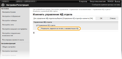 Включение управления ИД отделов для заданий с компьютера). Однако, если флажок для этой настройки установлен, задания выполняются, даже если ИД и PIN-код не введены. Если требуется задать настройку таким образом, чтобы задания могли выполняться только после правильного ввода ИД и PIN-кода, снимите этот флажок.