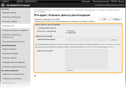 При неправильном вводе IP-адресов доступ к аппарату с Удаленным ИП может быть заблокирован. В этом случае необходимо установить для параметра <Фильтр IPv4-адресов> или <Фильтр IPv6-адресов> значение <Выкл.>.