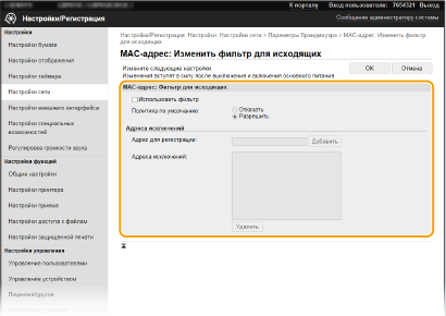 При неправильном вводе MAC-адресов доступ к аппарату с Удаленного ИП может быть заблокирован. В этом случае необходимо указать для параметра <Фильтр MAC-адресов> значение <Выкл.>. <Фильтр MAC-адресов>