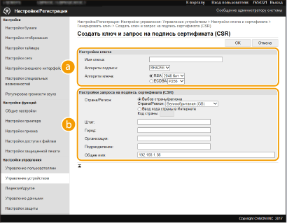 Поскольку у сертификатов, сгенерированных на аппарате нет цифровой подписи CA, в зависимости от того, с каким устройством устанавливается связь, может возникнуть ошибка связи. Чтобы центр сертификации выдал сертификат с цифровой подписью CA, необходимо получить данные запроса на подпись сертификата (CSR), которые администратор может сгенерировать в Удаленном ИП. После выдачи сертификата зарегистрируйте его с помощью сгенерированного с помощью CSR ключа.
