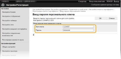 Ключ и сертификат или сертификат CA устанавливаются на аппарат с компьютера.
