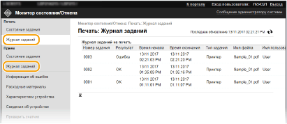 Нажмите [Номер задания] на документах, печать которых была приостановлена, или для которых используется безопасная печать, чтобы просмотреть подробную информацию. Можно просмотреть имя пользователя и количество страниц печатаемого документа.
