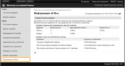 Отображаются общее количество распечаток и помесячный отчет об общем расходе электроэнергии. Можно открыть экран экологической информации и изменить настройки для экономии бумаги и электроэнергии.
