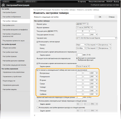 *Если автоматическое отключение питания в указанное время невозможно, выполняется до 10 повторных попыток с интервалом одна минута. Если не удается выключить питание даже после десяти повторных попыток, автоматическое выключение в этот день будет невозможно.