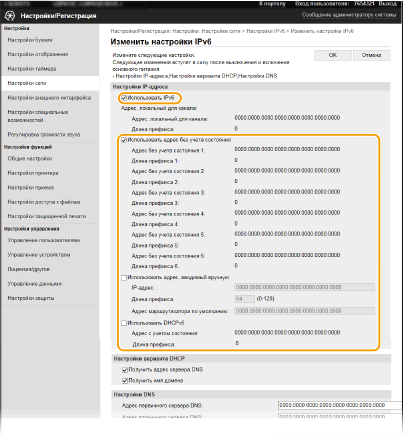 Адреса IPv6 для аппарата можно настроить посредством Удаленного ИП. Перед настройкой адресов IPv6 проверьте настройки адреса IPv4 (Просмотр настроек IPv4). Для использования адресов IPv6 необходимо правильно настроить адреса IPv4. Аппарат может использовать насколько следующих адресов IPv6: