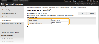 SMB (блок сообщений сервера) представляет собой протокол для общего доступа к ресурсам (например, файлам и принтерам) для нескольких устройств в сети. Этот протокол требуется использовать, чтобы настроить аппарат в качестве общего принтера в сети SMB. В зависимости от особенностей сети, возможно, потребуется настроить имя NetBIOS и имя рабочей группы.
