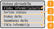 ), tiek parādīts ekrāns, kurā varat pārbaudīt dokumentu apstrādes norisi, kā arī iekārtas statusu (tonera kasetnēs atlikušo tonera daudzumu utt.) un tīkla iestatījumus, piemēram, iekārtas IP adresi.