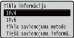 Parāda tādus tīkla iestatījumus kā iekārtas IP adresi un tādu statusu kā bezvadu LAN sakaru stāvokli.