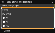 Kad ir reģistrēts noklusējuma papīra iestatījums, ievietojot papīru, netiek rādīts papīra iestatījumu ekrāns un vienmēr tiek lietots viens un tas pats iestatījums. Ja ievietosit cita formāta vai veida papīru, bet nemainīsit papīra iestatījumus, iekārta, iespējams, nedrukās pareizi. Lai novērstu šo problēmu, 3. darbībā izvēlieties <Norādīt, ievietojot papīru> un pēc tam ievietojiet papīru.
