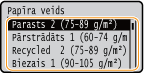 Ar iepriekš aprakstīto procedūru reģistrētie papīra formāti tiek parādīti papīra atvilktnes vai daudzfunkciju papīrtura papīra formāta izvēles ekrānā.