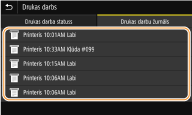 Izvēlieties dokumentu, kura žurnālu vēlaties pārbaudīt.Statuss <Labi> tiek parādīts, ja dokuments ir sekmīgi izdrukāts, savukārt statuss <Kļūda> tiek parādīts, ja dokumenta drukāšana neizdevās, jo drukāšana tika atcelta vai radās kļūda.