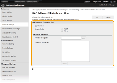 Jei MAC adresai bus įvesti neteisingai, gali būti, kad negalėsite pasiekti aparato naudodami priemonę „Remote UI“ (Nuotolinio vartotojo sąsaja). Tokiu atveju parinktį <MAC adreso filtras> turėsite nustatyti kaip <Išjung.>. <MAC adreso filtras>
