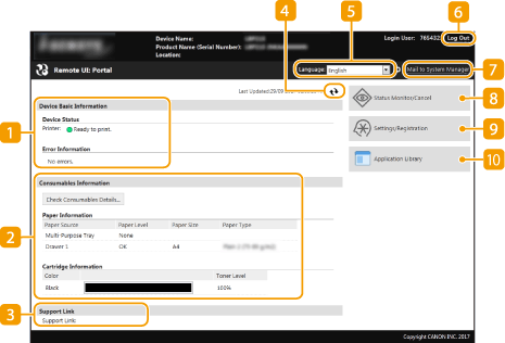 Prisijungus prie „Remote UI“ (Nuotolinio vartotojo sąsaja) rodomas šis portalo puslapis. Skyriuje aprašyti portalo puslapyje rodomi elementai ir pagrindinės operacijos.