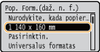 Anksčiau aprašytos procedūros metu užregistruotą formatą galima iškviesti popieriaus formato pasirinkimo ekrane pasirinkus popieriaus stalčių arba universalųjį dėklą <Pasirinktinis>.