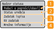 Prikazuje status uređaja, kao što je količina papira ili preostalog tonera u spremnicima.