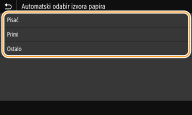 Omogućite ili onemogućite značajku automatskog odabira izvora papira za svaki izvor papira. Ako je ta značajka postavljena na <Uključ.>, uređaj automatski odabire izvor papira koji se umeće s papirom odgovarajuće veličine za svaki zadatak ispisa. Kada papir u odabranom izvoru papira nestane, ta postavka omogućuje nastavak ispisa prebacivanjem s jednog izvora papira na drugi u koji je umetnut papir istog formata.