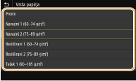Če se ta zaslon ne prikaže, ko naložite papirČe v večnamenski pladenj vedno naložite enak papir, lahko vsakokratno nastavljanje papirja preskočite tako, da velikost in vrsto papirja registrirate kot privzeto nastavitev. Ko registrirate privzeto nastavitev, se zgornji zaslon ne prikaže. Zaslon odprete, tako da izberete <Določi pri nalaganju papirja> (Registracija privzetih nastavitev papirja za večnamenski podstavek).