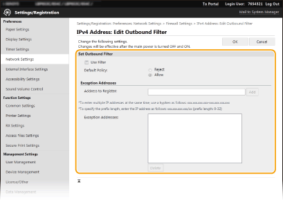 Ако IP адресите са въведени неправилно, може да не успеете да отворите устройството от Remote UI (Потребителски интерфейс за отдалечено управление), като в този случай е необходимо да зададете <Филтър за IPv4 адрес> или <Филтър за IPv6 адрес> на <Изкл.>.