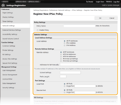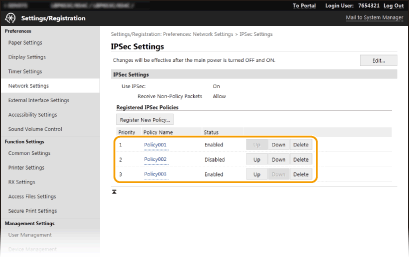 Използване на работния панелМожете да разрешите или забраните шифрованата с IPSec комуникация също и от <Меню> в екрана Начало. <Използване на IPSec>
