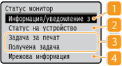 Показва състоянието на устройството, като например количеството хартия или количеството тонер, оставащо в тонер касетите.