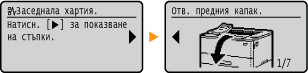 В някои случаи, когато възникне грешка, се извеждат инструкции как да се реагира при тази грешка. Следвайте инструкциите на екрана, за да отстраните проблема. Екранът, който се извежда при засядане на хартия, е показан по-долу като пример.