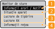 Afişează starea aparatului, cum ar fi cantitatea de hârtie sau nivelul de toner disponibil în cartuşe.