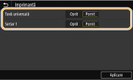 Activaţi sau dezactivaţi funcţia de selectare automată a sursei de hârtie pentru fiecare sursă de hârtie. Dacă această funcţie este setată la <Pornit>, aparatul selectează automat o sursă de hârtie care este încărcată împreună cu hârtia de format corespunzător pentru fiecare lucrare de imprimare. De asemenea, când se termină hârtia din sursa de hârtie selectată, această funcţie permite continuarea imprimării prin trecerea de la o sursă de hârtie la alta care este încărcată cu acelaşi format de hârtie.