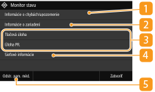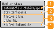 ), zobrazí sa obrazovka, na ktorej môžete skontrolovať postup spracovania dokumentov, stav zariadenia (zostávajúce množstvo tonera v kazetách s tonerom atď.) a nastavenia siete, napríklad adresu IP zariadenia.