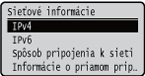 Zobrazí nastavenia siete, ako je adresa IP stroja, a stav stroja, ako napríklad stav bezdrôtovej komunikácie LAN.
