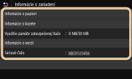 Zobrazí stav zariadenia, napríklad množstvo papiera alebo zostávajúce množstvo tonera v kazetách s tonerom.