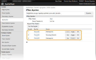 İşletim panelini kullanmaIPSec iletişimini, Ana Ekran'daki <Menü> öğesinden de etkinleştirebilir veya devre dışı bırakabilirsiniz. <IPSec Kullan>