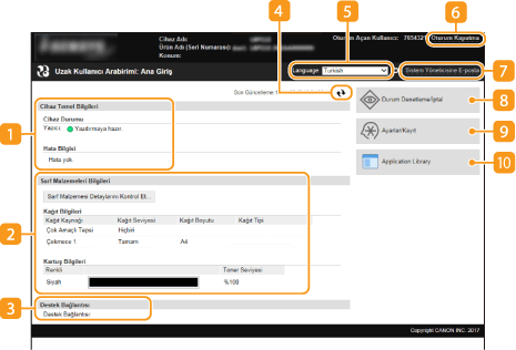 Uzak Kullanıcı Arabiriminde oturum açtığınızda, aşağıdaki Portal sayfası görüntülenir. Bu bölümde, Portal sayfasında görüntülenen öğeler ve temel işlemler açıklanmaktadır.