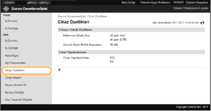 Makine ve sistem yöneticisiyle ilgili bilgiler görüntülenir. [Kullanıcı Yönetimi] sayfasında [Sistem Yöneticisi Bilgisi] öğesindeki veya [Cihaz Yönetimi] sayfasında [Cihaz Bilgisi Ayarları] öğesindeki ayarlara karşılık gelen aygıt adı ve diğer sistem yöneticisi bilgileri burada görüntülenir.