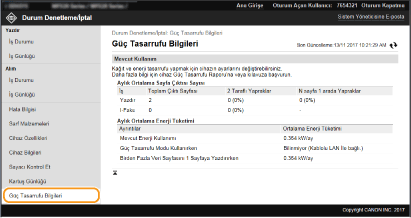 Aylık toplam çıktı miktarı ve güç tüketimi görüntülenir. Tasarruf Modu Bilgisi ekranını görüntüleyebilir ve kağıt ve güç tüketimi tasarrufu için ayarları değiştirebilirsiniz.