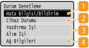 Makinenin IP adresi gibi ağ ayarlarını ve kablosuz LAN iletişimlerinin durumu gibi durumları görüntüler.