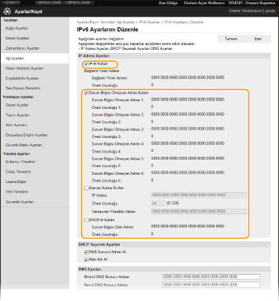 Makinenin IPv6 adresleri, Uzak Kullanıcı Arabirimi aracılığıyla yapılandırılabilir. IPv6 adreslerini ayarlamadan önce IPv4 adres ayarlarını kontrol edin (IPv4 Ayarlarını Görüntüleme). IPv6 adreslerini kullanmak için doğru IPv4 ayarlarını ayarlamanız gerekir. Makine, aşağıdaki IPv6 adreslerinden birden fazlasını kullanabilir: