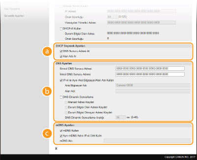 Makinenin IP adresi her değiştiğinde DNS kayıtlarını dinamik olarak güncellemek için onay kutusunu seçin. DNS sunucusuna kaydetmek istediğiniz adres türlerini belirtmek için [Manüel Adresi Kaydet], [Durum Bilgisi Olan Adresi Kaydet] veya [Durum Bilgisi Olmayan Adresi Kaydet] onay kutusunu seçin. Güncellemeler arasındaki aralığı belirtmek için [DNS Dinamik Güncelleme Aralığı] metin kutusuna zamanı saat cinsinden girin. [mDNS Ayarları][mDNS Kullan]