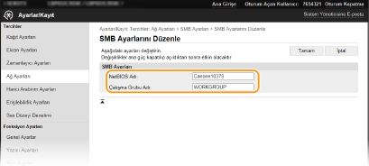 Sunucu İleti Bloğu (SMB), bir ağ üzerinde dosya ve yazıcı gibi kaynakları birden çok aygıt arasında paylaşma protokolüdür. Makineyi bir SMB ağı üzerinde paylaşılan bir yazıcı olarak yapılandırmak için bunu kullanmanız gerekmektedir. Ağınıza bağlı olarak, NetBIOS adını ve çalışma grubu adını ayarlamanız gerekebilir.